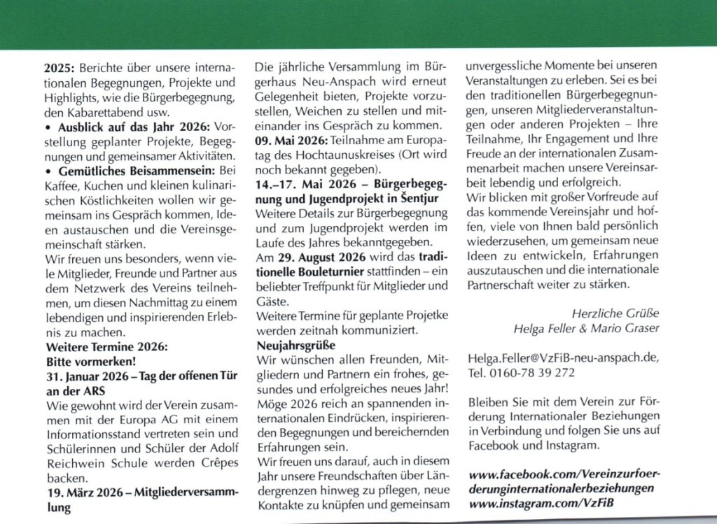 Am 26. März 2025 fand die diesjährige Mitgliederversammlung des Vereins zur Förderung internationaler Beziehungen (VzFiB) im kleinen Saal des Bürgerhauses Neu-Anspach statt. Neben einem Rückblick auf ein ereignisreiches Jahr 2024 wurden auch die Weichen für kommende Projekte gestellt – inklusive Vorstandswahlen und Ausblick auf bevorstehende Veranstaltungen.