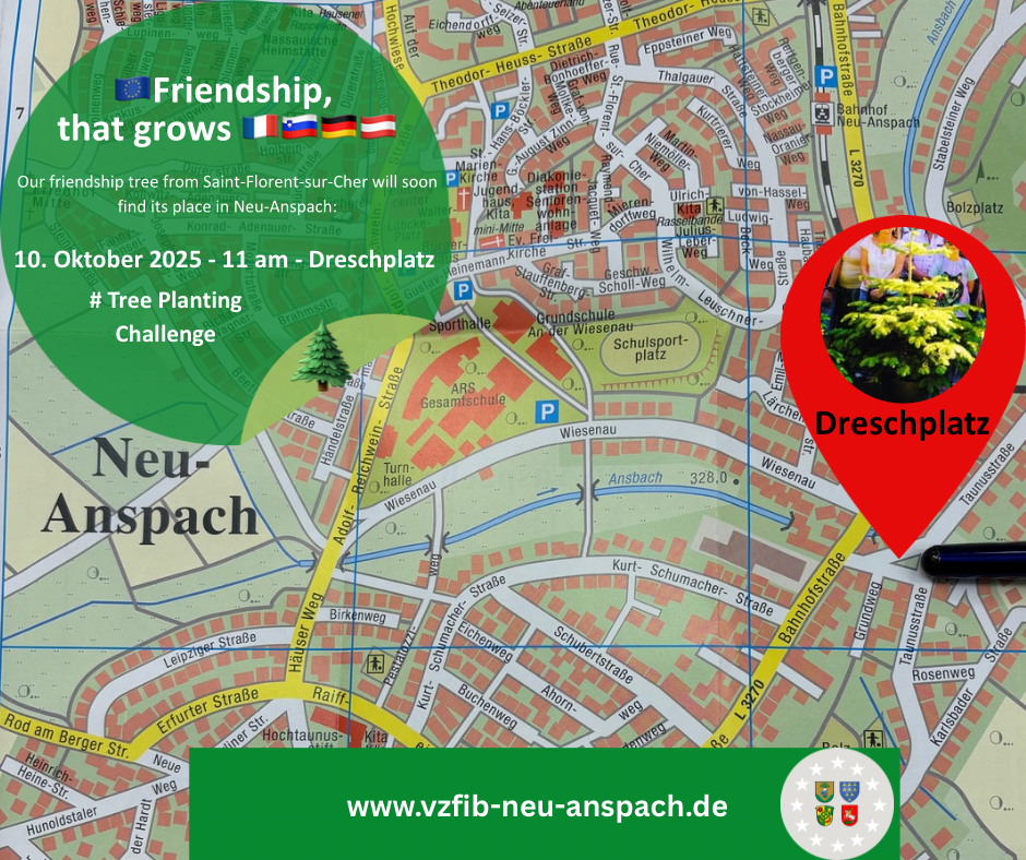 On Friday, 10 October 2025 at 11 a.m., the time has come: the friendship tree that we received from Mayor Marie-Line Cirre during the Citizens’ Meeting 2025 in Saint-Florent-sur-Cher will find its new home on the threshing floor in Neu-Anspach. Under the expert guidance of district forester Christian Wählert and under the supervision of Mayor Birger Strutz as well as members and sympathisers of our association and Waldliebe e.V., the planting will be carried out.